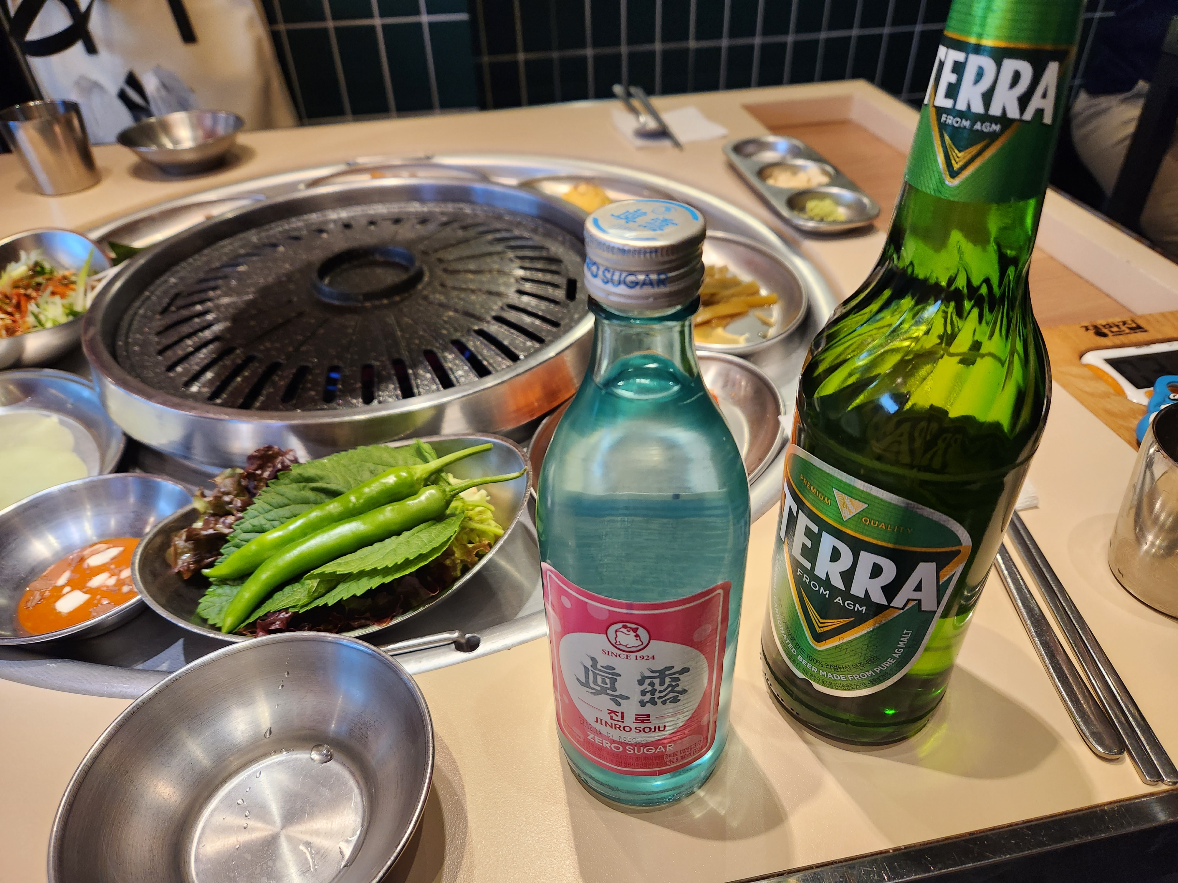 삼겹살에 소주가 빠질 수 없죠. 저는 진로 제로가 뭐가 다른지 잘 모르겠지만 일단 제로로 시켜봅니다.