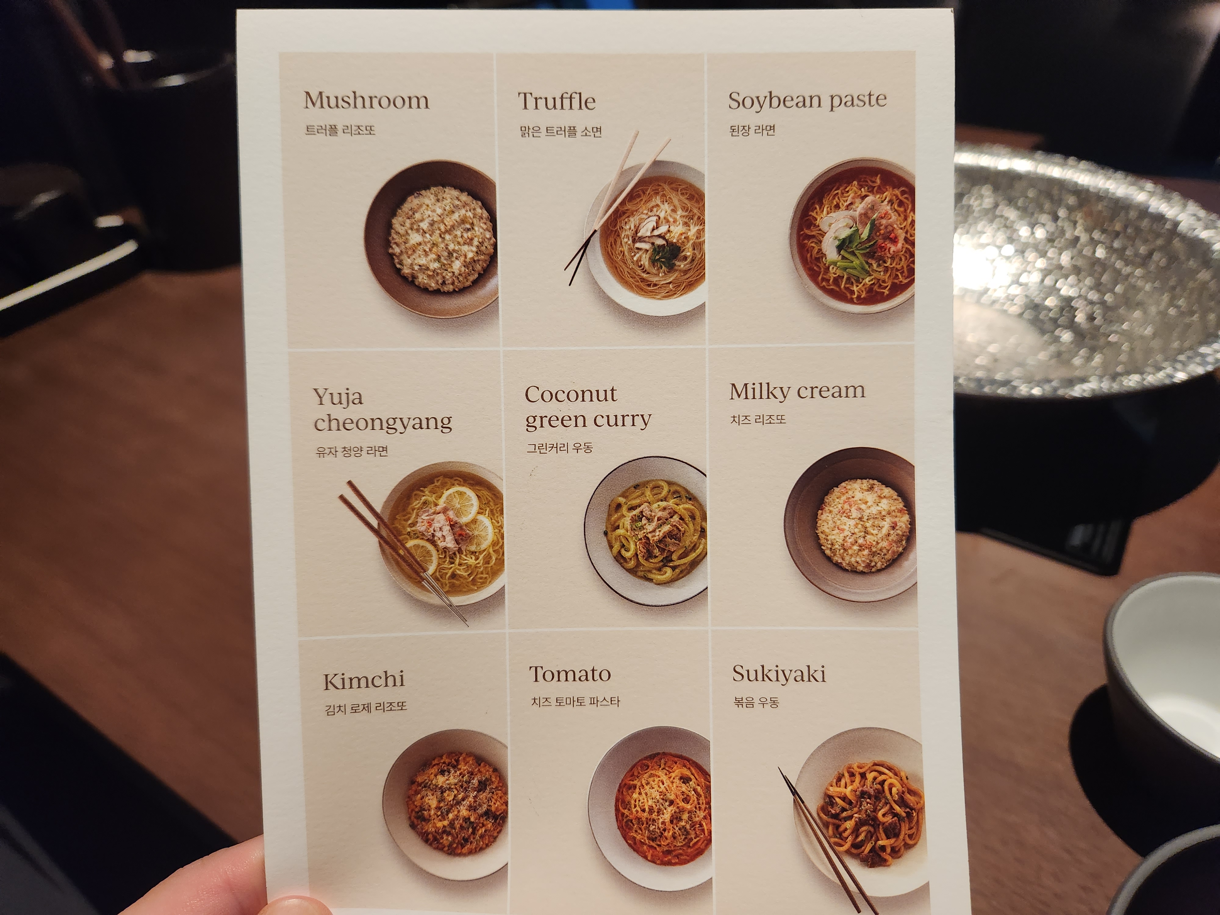 저는 이게 너무 신기했는데, 육수 종류가 12가지나 있다는 점이 신기했어요. 솔직히 12가지 육수 다 궁금하긴 한데, 그래도 처음이다보니 너무 특이한 육수는 지양하기로 했습니다. 개인적으로 트러플을 너무 좋아하는 편이라 트러플 육수를 골랐어요.